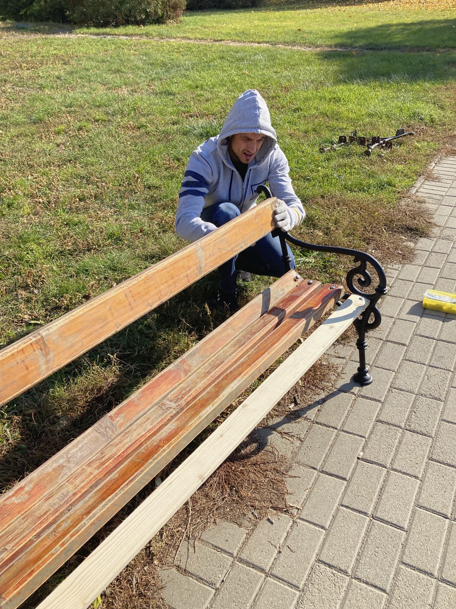 Először szétszedtük a buszmegállóban álló padot, és a hiányos karfa részt kicseréltük egy újra. A léceket lecsiszoltuk, visszacsavaroztuk, majd lefestettük. Egyelőre még ragad, száradnia kell: tettünk rá feliratot, hogy a hétvégén semmiképpen se üljön rá senki, mert megfoghatja a ruháját a festék.