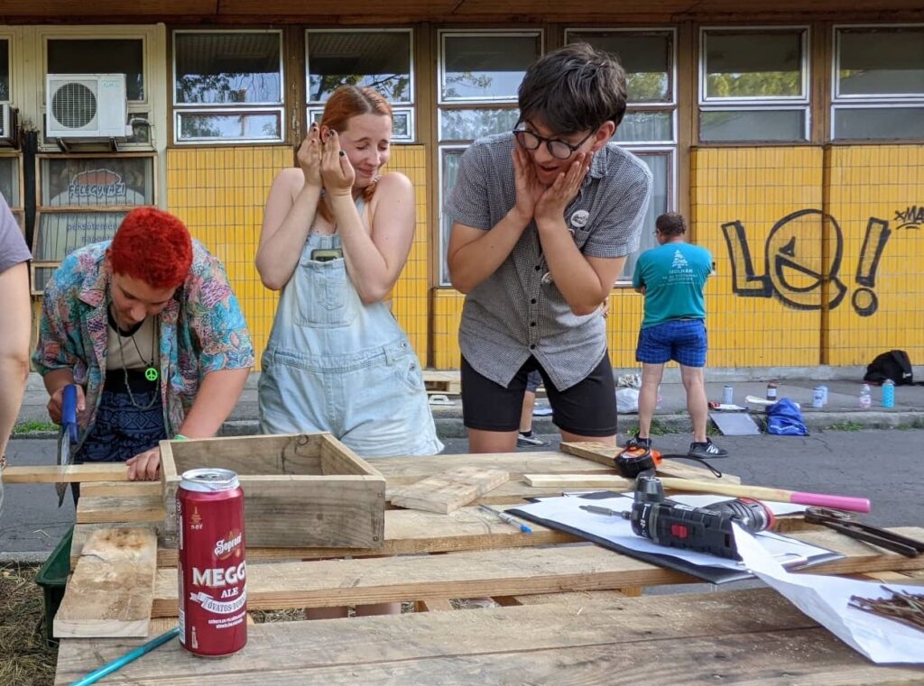 Július első vasárnapján barkácsolós délutánt tartunk a széchenyivárosi posta melletti kis téren: egyutas raklapokból készítettünk különféle kreatív dolgokat, valamint szépen le is festettük őket. Egyúttal felmértük a tér hiányosságait, mivel a későbbiekben szeretnénk majd rendbe hozni és visszaadni azt a környéken élők számára, sőt további klassz programokat szervezni oda.