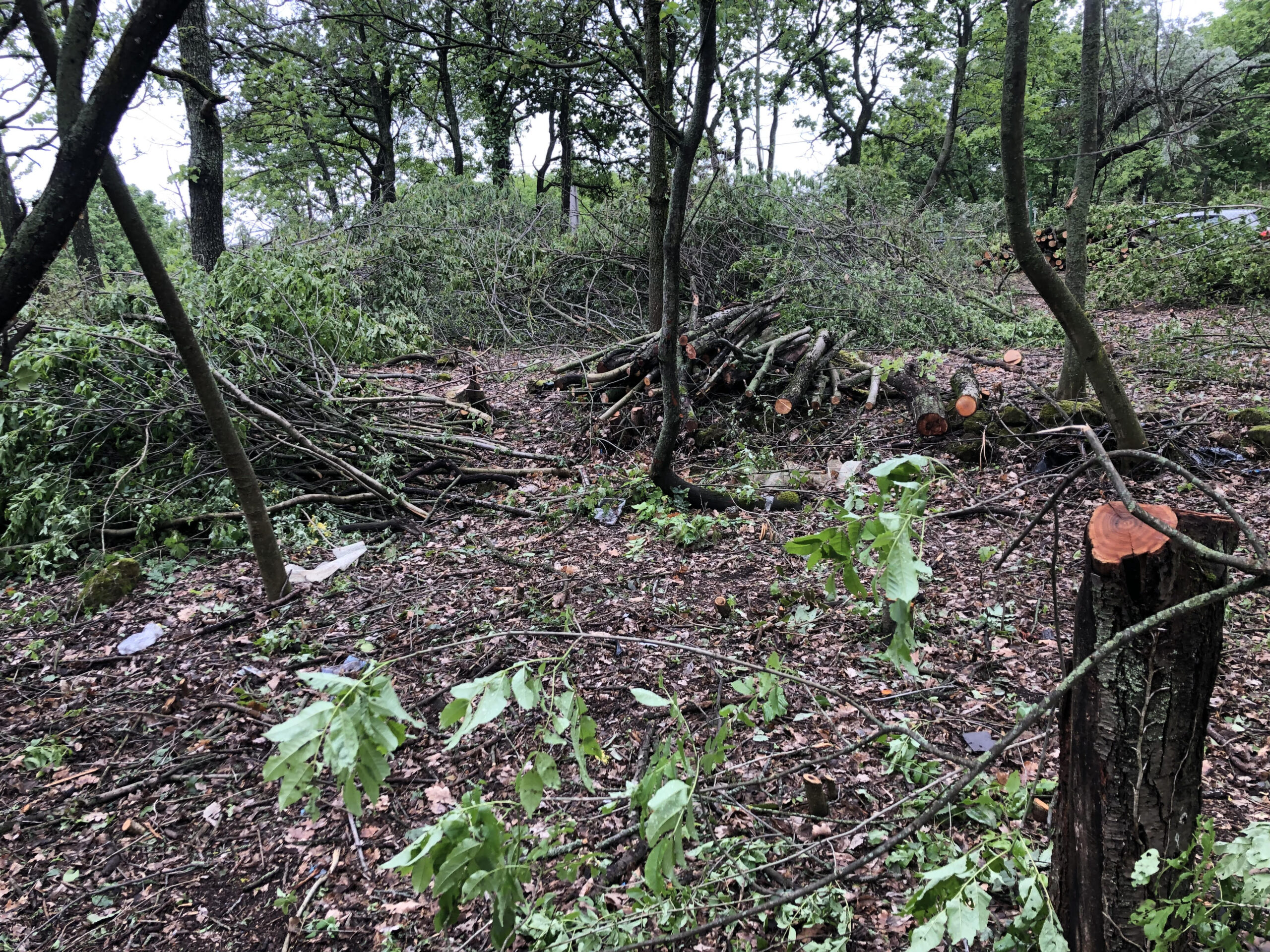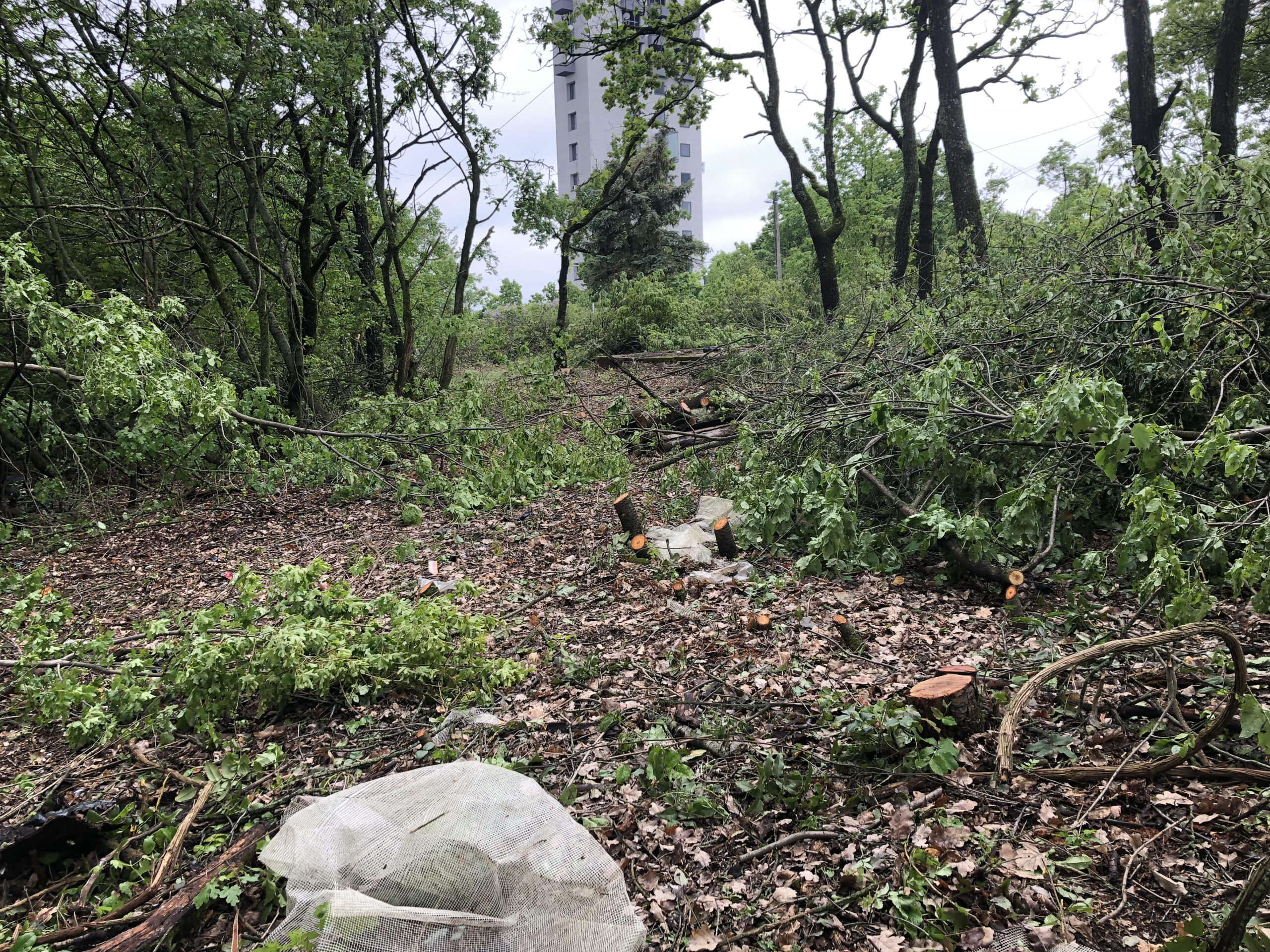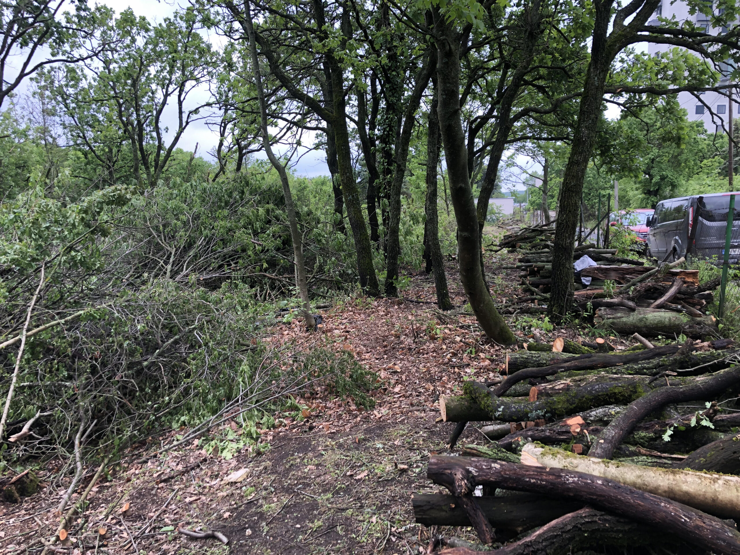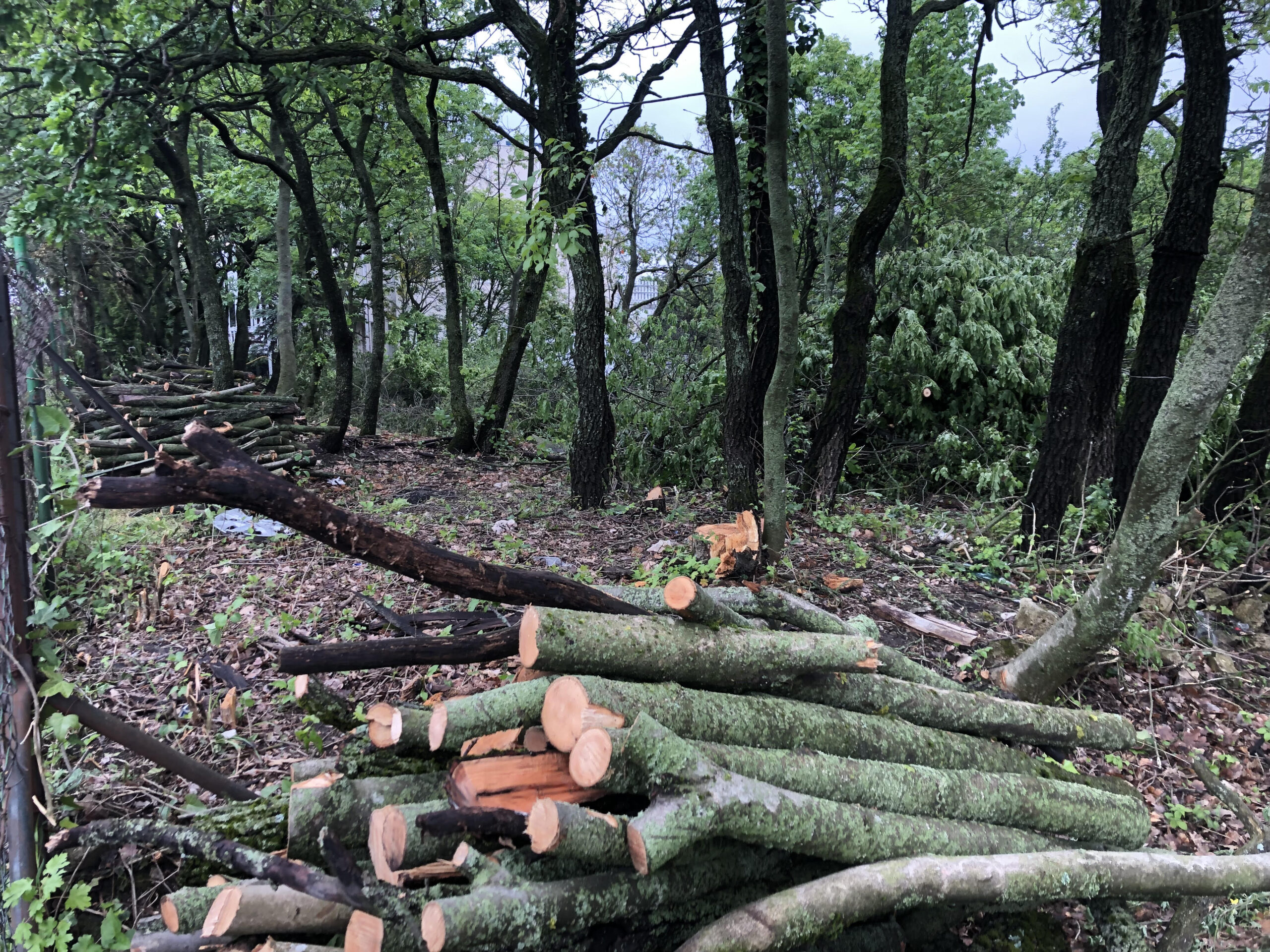A Pipiske, a Csíz és a Farkasvölgyi út közti telkeken múlt hét hétfőn reggel 9 órától kezdődően 6 fős láncfűrészes csapat fakivágási tevékenységre kezdte adni a fejét. A kivágott fatörzsek átmérője jelentős számban (több tucatnyi esetben) a 10 cm-t meghaladja, 30 cm átmérőjű 50-60 éves tölgyfákat is kivágtak. A ki nem vágott nagy méretű fákat jelentős mértékben csonkolják. Mivel a munkások nem irányítottan végezték a tevékenységet, a kivágott és ki nem vágott fák nincsenek megjelölve, munkavédelmi eszközöket nem használtak ezért feltételezhető volt, hogy a fakivágás nem engedélyezett módon történik.