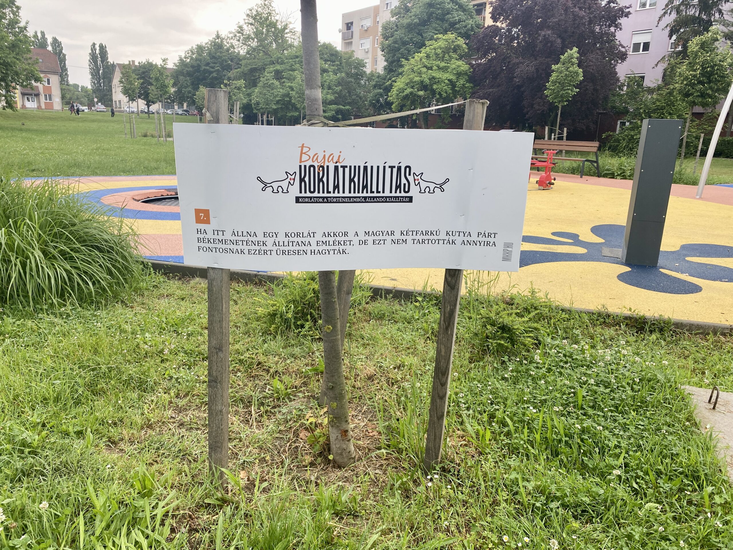 Baján a piactérnek is használt parkoló szélén, az árokparton valamilyen oknál fogva 10 méterenként sorakozik egy-egy rozsdás korlátdarab. Nagytotálban így néznek ki: