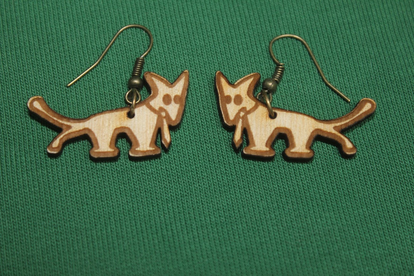 Lézerkarddal vágott, kizárólag természetes, a természetben megtalálható anyagokból készült, de rétegelt mahagóninak kinéző fülbevaló aranynak kinéző réz foglalattal.